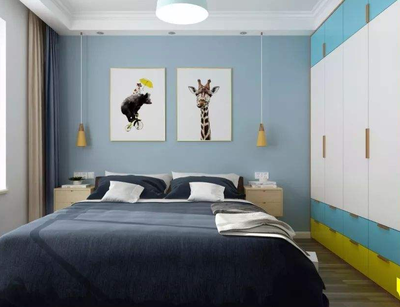 卧室:采光极好,色彩搭配方面突出层次感,浅蓝色的背景墙搭配藏青色的床品,柠檬黄的吊灯和衣柜上的一抹黄是最好的点缀,这里也使用了色彩搭配的技巧,喜欢这组配色的朋友们可以学习参考。这里需要夸一夸床头的两组装饰画,其实整个卧室的风格有些沉闷,不够活泼,所以选择了两组小动物出现在装饰画中,一下子就让卧室的风格显得年轻有活力。