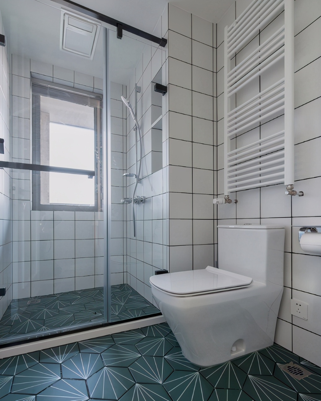 卫生间:卫生间使用六边形的纹理地砖,看上去格外有风格,除此之外使用白色,不用担心怎么搭配才看上去好看,毕竟白色非常百搭。马桶的一侧还有一个小插座,有时候一边蹲坑一边玩手机就不用担心手机没电这种小问题,不过还是不要蹲坑玩手机的好。