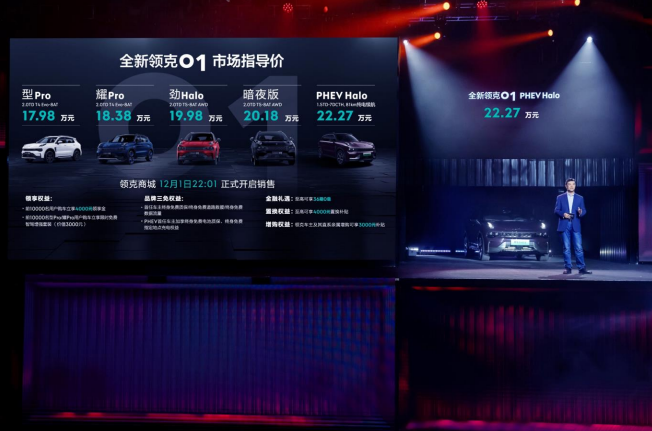 12 月 1 日,作为领克基于 CMA 架构的首款全 球战略产品,“新全球高端 SUV”全新领克 01 正式上市,新车提供燃油、PHEV 插电混合动力两种能 源驱动形式,共计发布五款车型,分别为型 Pro、耀 Pro、劲 Halo、暗夜版及 PHEV Halo,售价区间 为 17.98 万-22.27 万元,不同价位满足当今社会初入职场的工薪阶层,让大家在这个冬天,都可以温暖出行、平安回家。新年就要到了,它也可以是你带回家的伙伴,里子面子都给大家挣回来。