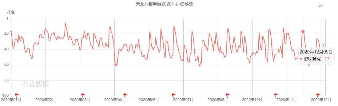 根据七麦的数据显示,在AppStore畅销榜单上,在即将过去的2020年,《天龙八部手游》一直稳定的在畅销榜30左右徘徊。