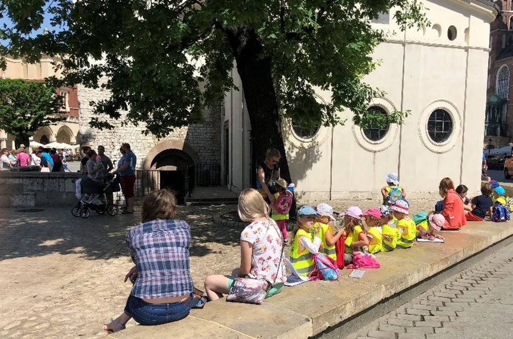 在克拉科夫老城的广场上,在和煦的阳光下,看见几个老师带着一群可爱的小朋友,他们约五、六岁,穿着鲜艳的黄绿色安全背心,坐在一堵矮墙上休息,开心地吃着东西,叽叽喳喳地闹腾着。