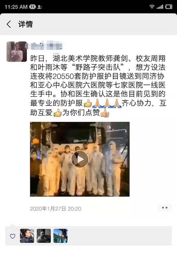 一些艺术家则直接参与支援医院的抗疫,如湖北美术学院教师龚剑、校友周翔和叶雨沐等“野路子突击队”,想方设法连夜将20550套防护服护目镜,送到同济、协和、亚心中心医院、六院等七家医院一线医生手中。协和医生确认这是他目前见到的最专业的防护服。