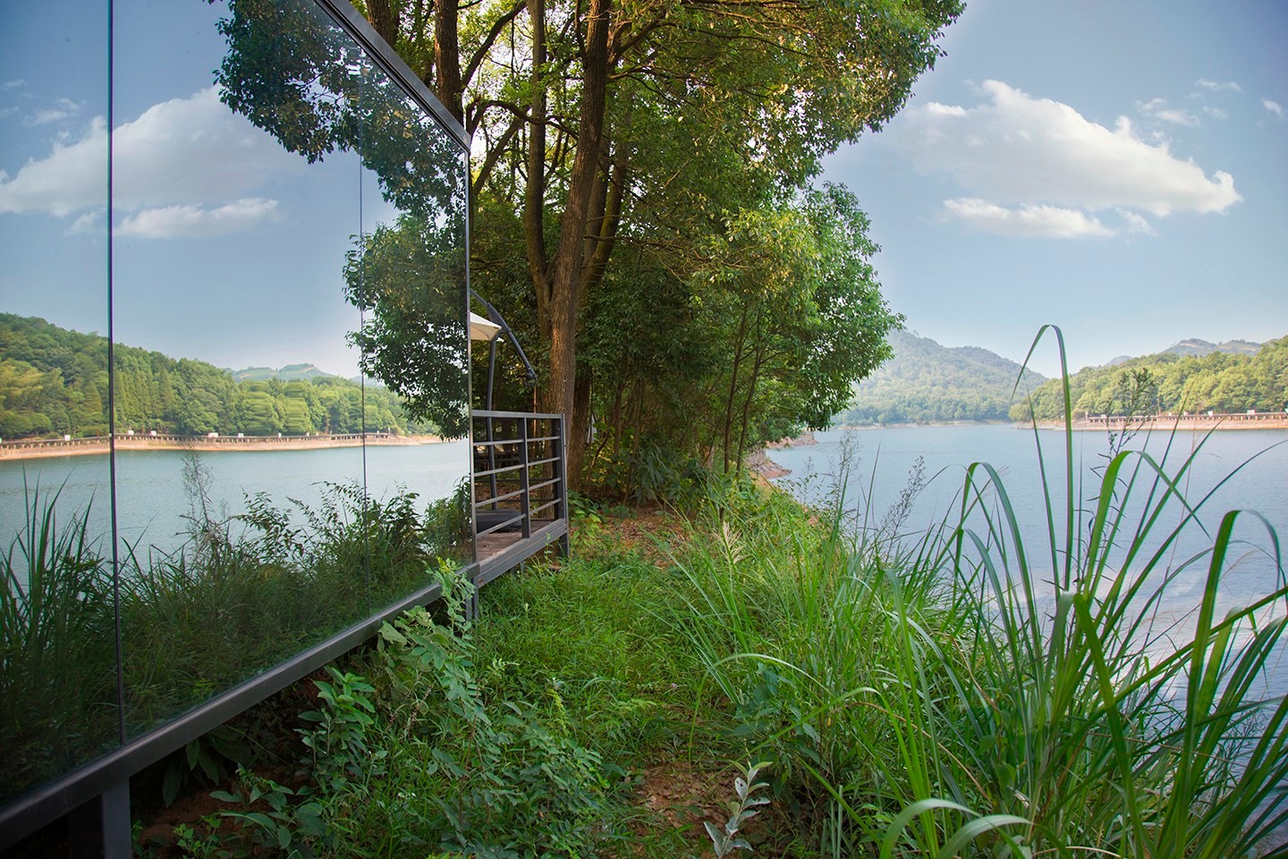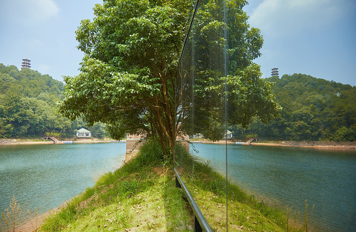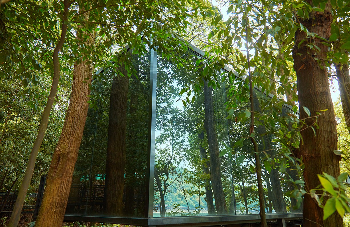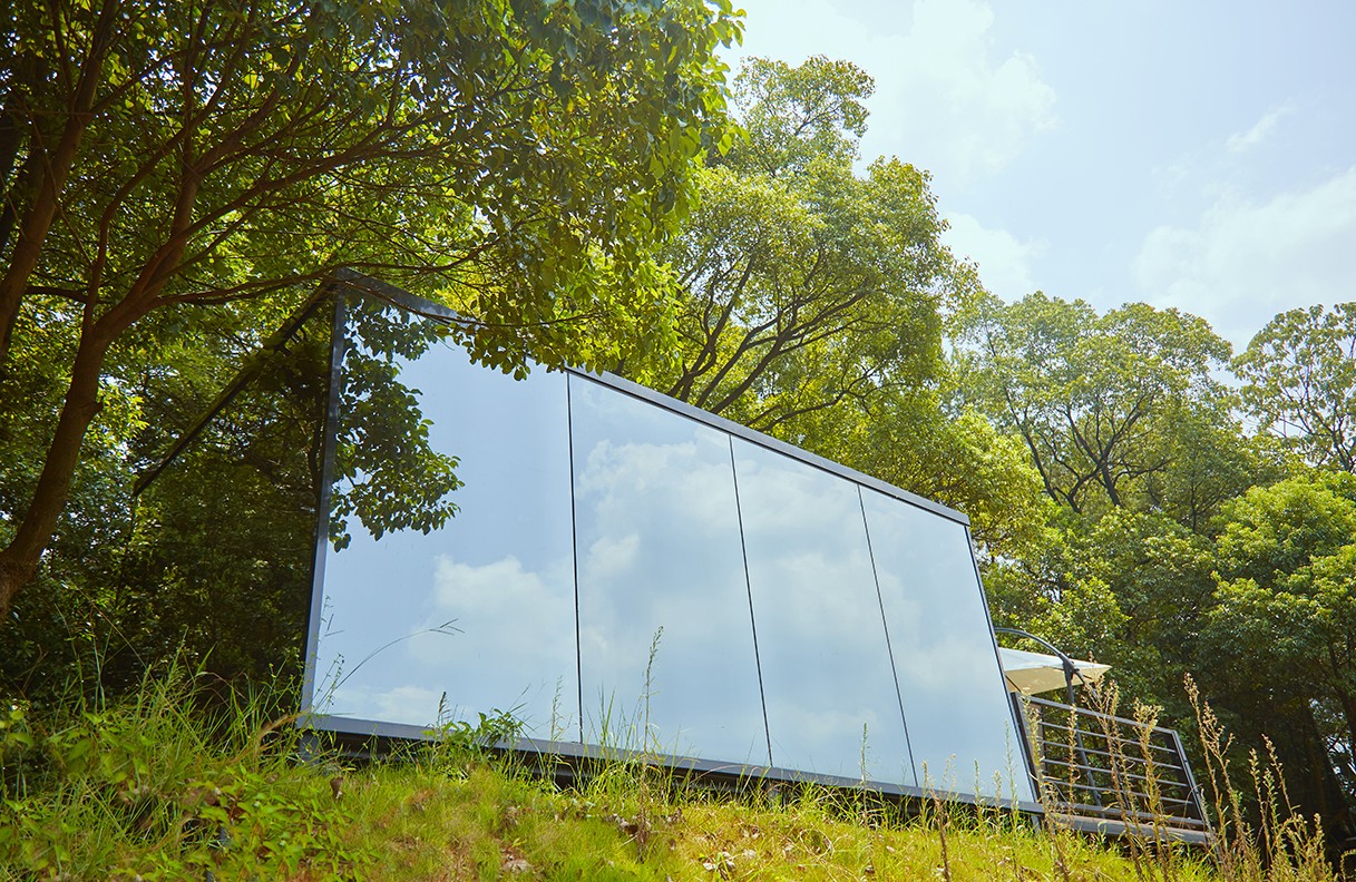 《镜界》可移动野墅民宿酒店介绍:镜界,顾名思义,这是个与镜子有关的建筑。别墅整体采用轻钢结构,外立面采用反光的镜面,建在自然区,可以完美映射出大自然的绿意盎然和山明水秀。别墅底部采用支架平台,很好的隔绝了地面的潮湿和一些虫蚁等。别墅周围搭建木质平台和围栏,以花草树木为遮挡,呈现出一个天然的自然休闲区域。