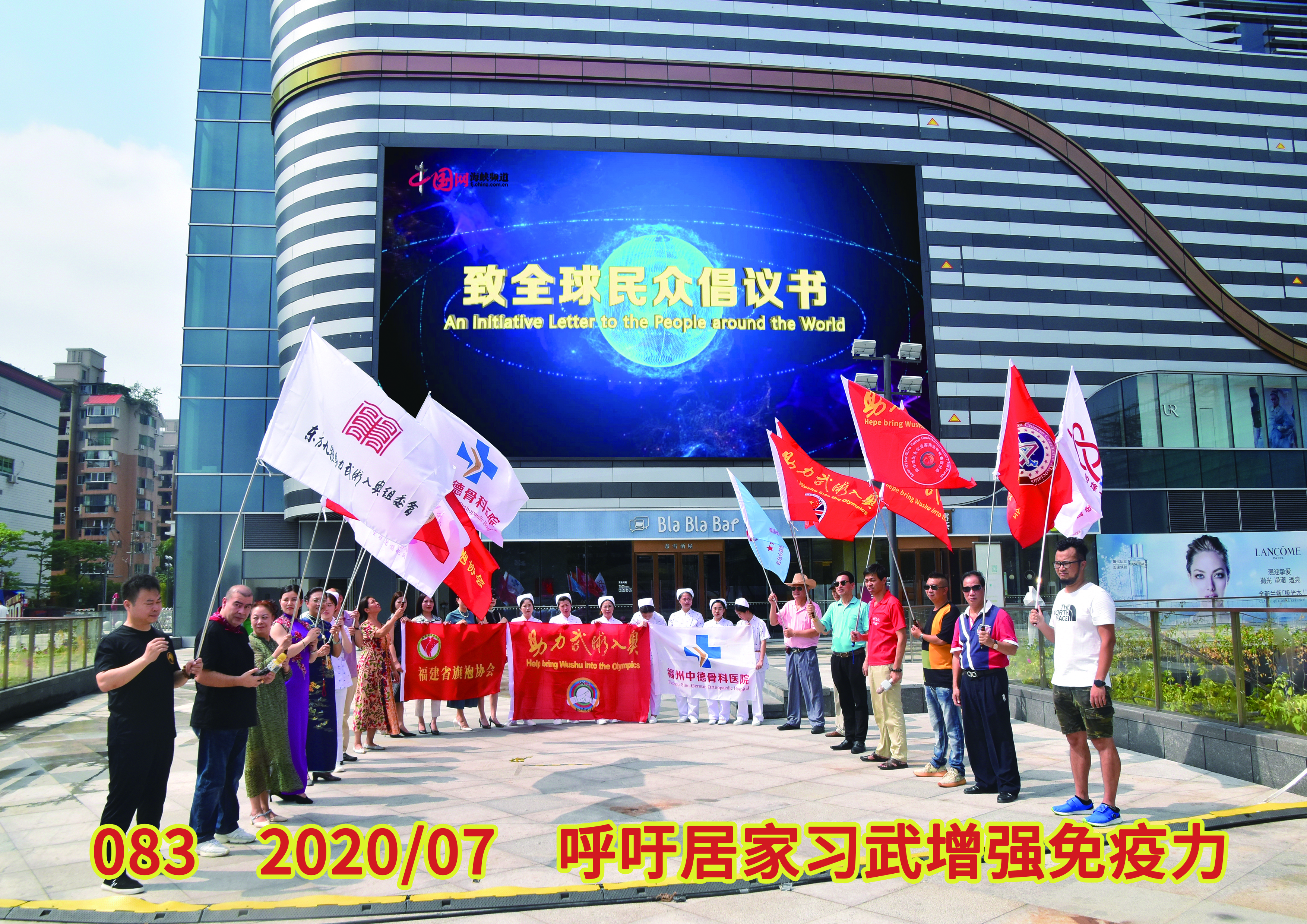 27、7月,来自全球各地的数十个社团代表在福州苏宁广场,再次呼吁全球民众以居家习武增强免疫力的方式来团结“抗疫”。