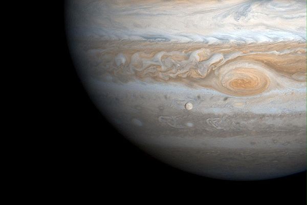 距离是骗人的。看起来与木星相对的木卫二,在行星云顶上方600,000公里(370,000英里)。左下角的木卫四距离云顶的距离几乎是其三倍。木卫二比地球的月亮略小,并且拥有太阳系中最亮的表面之一。木卫四比其大50%——大约相当于土星最大卫星土卫六的大小——比木卫二黑三倍。在照片中,它的亮度必须相对木卫二和木星得到增强,以便看到木卫四。
