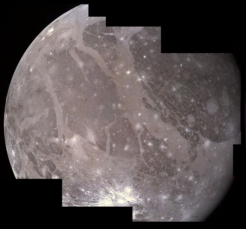 图解:旅行者2号拍摄的的木卫三背向木星一面的照片拼接图。较为古老的暗区——伽利略区位于右上方。它和另外一个较小的暗区——马里乌斯区之间隔着较为明亮也较为年轻的乌鲁克沟带。从相对较为年轻的奥里西斯陨石坑中喷出的冰体形成了图像底部明亮的辐射带。