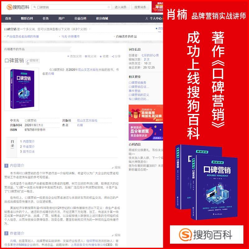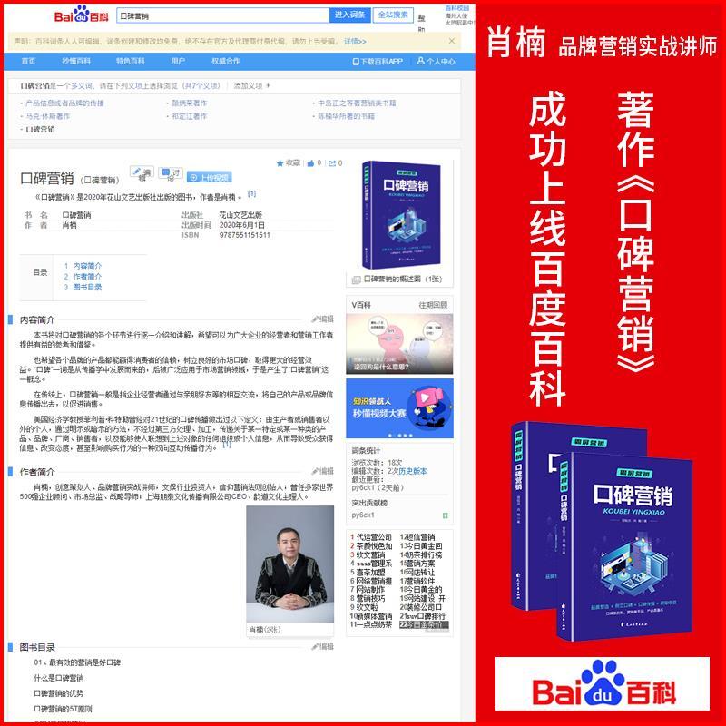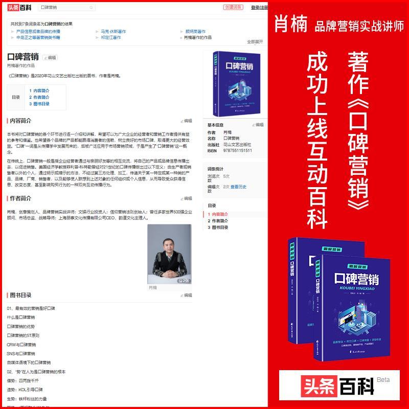 近日,由花山文艺出版社出版、出书大师网全权代理出版策划、肖楠老师等人创作的著作《口碑营销》正式上线百度百科、互动百科、搜狗百科等百科平台,自品牌影响力得到快速提升。