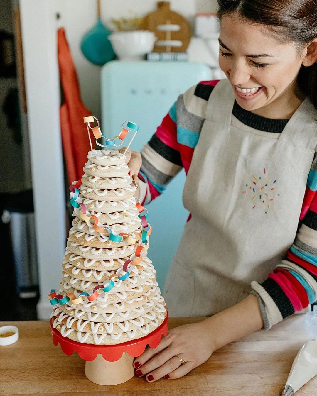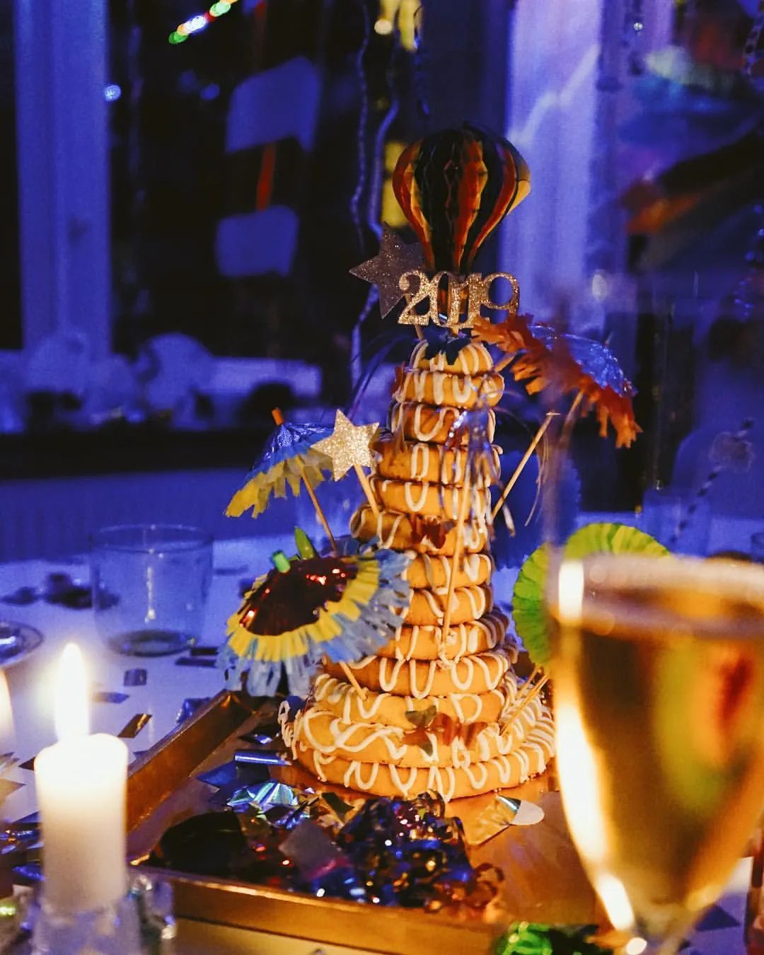 Kransekage 是 许多杏仁饼环堆成的“蛋糕塔”,