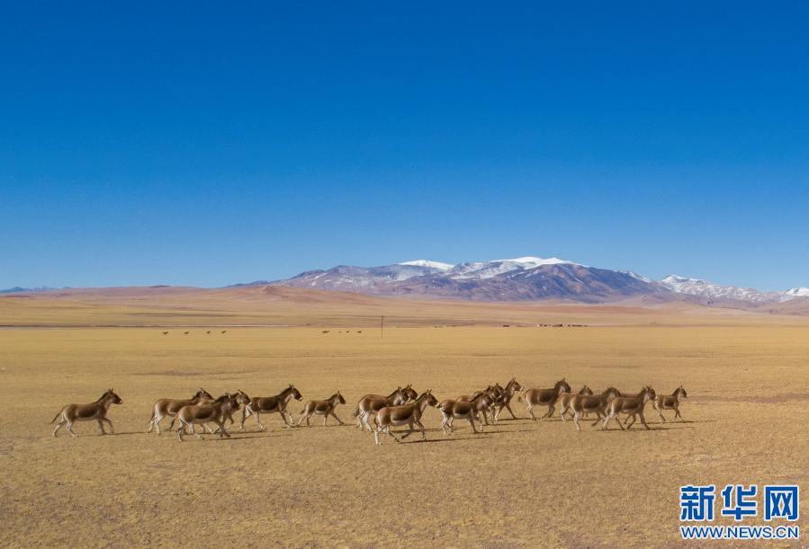 在西藏羌塘国家级自然保护区拍摄的一群奔跑的藏野驴(2019年12月23日摄,无人机照片)。新华社记者 孙非 摄