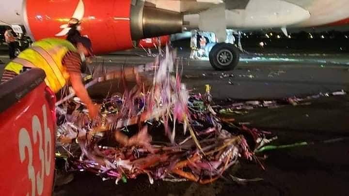 经机场消防队现场检查,所有乘客和机组人员状况良好。这架幸运的A319客机左右发动机、机翼、起落架、水平安定面均被气球残骸缠绕,
