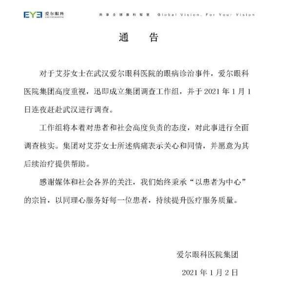 2021年1月2日,爱尔眼科微信公众号发布通告称,对于艾芬女士在武汉爱尔眼科医院的眼病诊治事件,爱尔眼科医院集团高度重视,迅即成立集团调查工作组,并于2021年1月1日连夜赶赴武汉进行调查。工作组将本着对患者和社会高度负责的态度,对此事进行全面调查核实。集团对艾芬女士所述病痛表示关心和同情,并愿意为其后续治疗提供帮助。