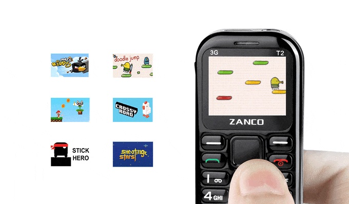 游戏方面,Zanco Tiny T2 支持 Doodle Jump、贪食蛇等 7 款游戏,重回十几年前的塞班智能机时代。