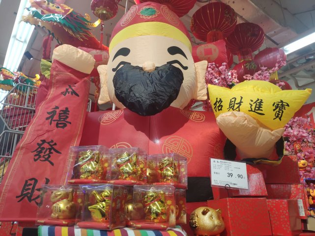 这尊财神爷,高3年,宽有1米多,中间是空气,充气型的,在底部有一个充气风机,不断的往里面鼓着气。财神爷身穿中国传统服饰,红色为主色调,喜气洋洋的,财神爷的两个小胡子更是一大亮点,圆咕隆咚的腮帮子更是一显富态,符合财神爷的做派和气场,就和古代的大贪官和珅一样,手里还拿着一个大号的金元宝,很胖很富态。不少市民都愿意和“财神爷”沾上点关系。估计超市就想到了这一点,所以弄出了这样一个充气版的“财神爷”来招揽生意。