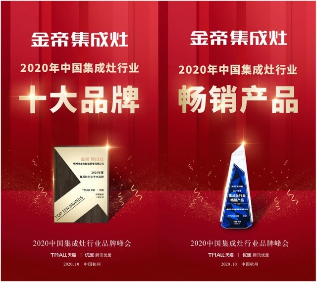 金帝在集成灶行业精心智造的12年里,获奖无数,得到过政府、行业以及用户的高度认可。今年10月,以“集健康灶幸福”为主题的第三届中国集成灶行业品牌峰会暨天猫双十一厨热购物季在浙江杭州隆重召开,金帝作为集成灶行业优秀品牌代表,荣获“2020年度集成灶行业十大品牌”与“2020年度集成灶行业畅销产品”双料大奖,成为本次峰会的大赢家。
