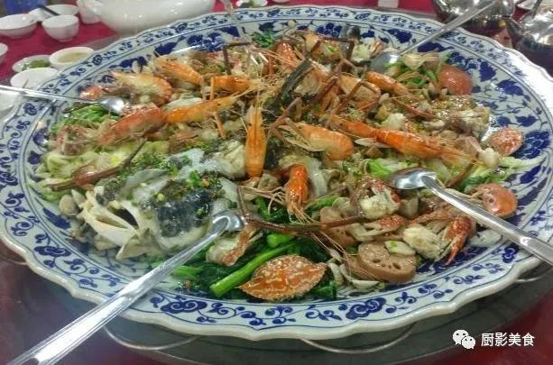 大盘大盘,四个壮汉一起抬过来,架势非常壮观,掀开锅盖,露出了真面目!直径从半米到一米不等的超大盘里,5斤以上的大鱼和白贝、鲜虾等提鲜之物共冶一炉,盘下橘焰跳动,桌面香气蒸腾。