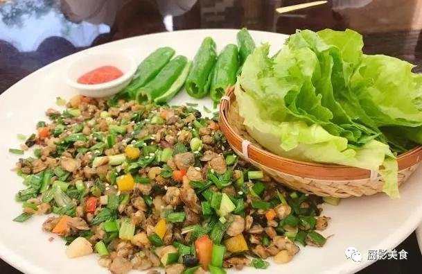 传统蚬肉生菜包原料特别丰富。要选用蚬肉、腊肠粒、韭菜粒、咸酸菜梗粒、藠白粒、青椒粒、虾米、葱粒等,将诸多原料加油盐炒香后,吃时将生菜包裹起炒的什锦菜,还可蘸辣椒或海鲜酱。免费加入厨影美食超级吃货群(加微信 xiaotudou2002 申请入群)。生菜尽量选择细嫩黄绿色的,口感脆爽而清香。有人评论吃生菜包“自食自包尝野趣,方知佳味出天然”,“辣酱拌来滋味好,菜包蚬肉溢乡风”。