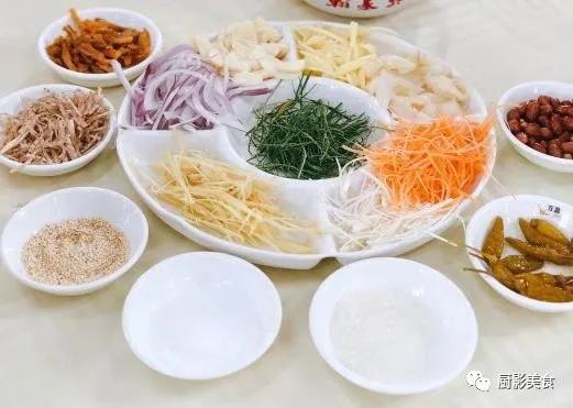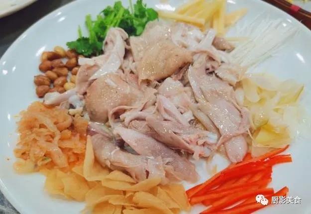 原料一般会选取养足120天的肥嫩小母鸡,先将整鸡去除内脏,洗净后用盐、酒腌过,再用鸡汤将鸡浸熟,晾凉后撕成条状。然后放入与葱丝、洋葱、花生、香菜等配料搅拌均匀,一口下去,鸡肉清爽滑嫩,花生香脆可口,葱丝清脆爽口,各种材料搭配在一起,口感层次极其丰富。捞好的鸡肉每一口都是不可多得的美味,从视觉到味觉都能给你满足。看看这薄而通透的鸡皮,一点也不会让人感觉肥腻,反而清脆爽口。