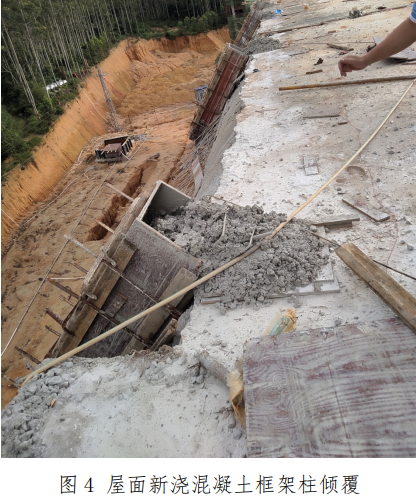 2、天面构架混凝土施工工序不当,未按要求先浇筑结构柱,待其强度达到75%及以上后再浇筑 屋面构架及挂板混凝土,且未设置防止天面构架模板支撑侧翻的可靠拉撑。