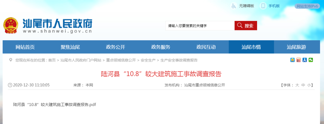 12月30日,汕尾市人民政府公布了《陆河县“10.8”较大建筑施工事故调查报告》。