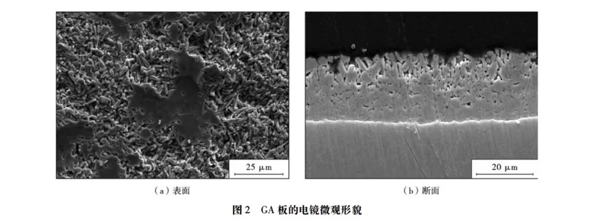 GA板是在镀锌后通过500~550℃热处理,让钢基体中的铁与锌相互扩散,形成锌铁合金相层的镀层钢板,镀层表面铁含量约10%( 质量分数)。
