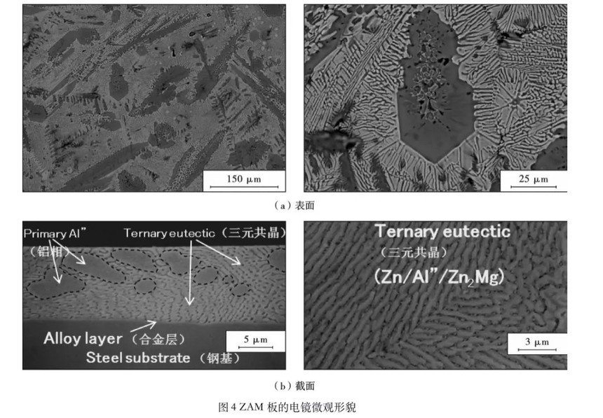 ZAM板镀层是外层和外层与基板交界处合金层组成,镀层外层由富铝相、Zn/Al/Zn2Mg三元共晶相组成,如图4a和图4b所示。ZnAlMg镀层的耐蚀性较GI镀层大幅提高,如ZAM板镀层耐蚀性甚至可达GI镀层耐蚀性的16倍。