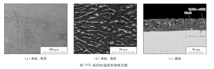 由图3可知,GL镀层是由两层组成,外层是铝锌合金层,由树枝状晶的富铝固溶体和枝晶间的富锌相组成。内层是铝锌铁金属间化合物层,它位于铝锌合金层和钢基体之间,与GI镀层结构类似,GL镀层的内层铝锌铁金属间化合物层起到避免铁元素进入铝锌合金层、 增加镀层附着力的作用,而硅的加入限制了脆性铝锌铁金属间化合物层的生长。