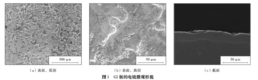 由图1a、 1b可知,GI板镀层表面为平台与均匀凹坑组成,形貌的形成主要是镀锌后经过一定粗糙度的光整辊使镀层表面形成粗糙度大约1μm的表面。由图1c可知,GI 板是由最表层纯锌层、钢基板及中间一层薄薄的抑制层即铁铝合金相层FeAl3或Fe2Al5相组成,铁铝合金相阻止了铁往锌层的扩散,避免镀层形成相对较脆的锌铁合金相,从而保证镀层的附着力。