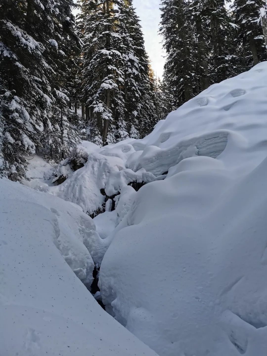 过小溪暗河已经不顾找路了,直接涉水通过,反正鞋里早就挤满了雪水。遇到落差直接就跳下去,反正已经没有痛觉了。