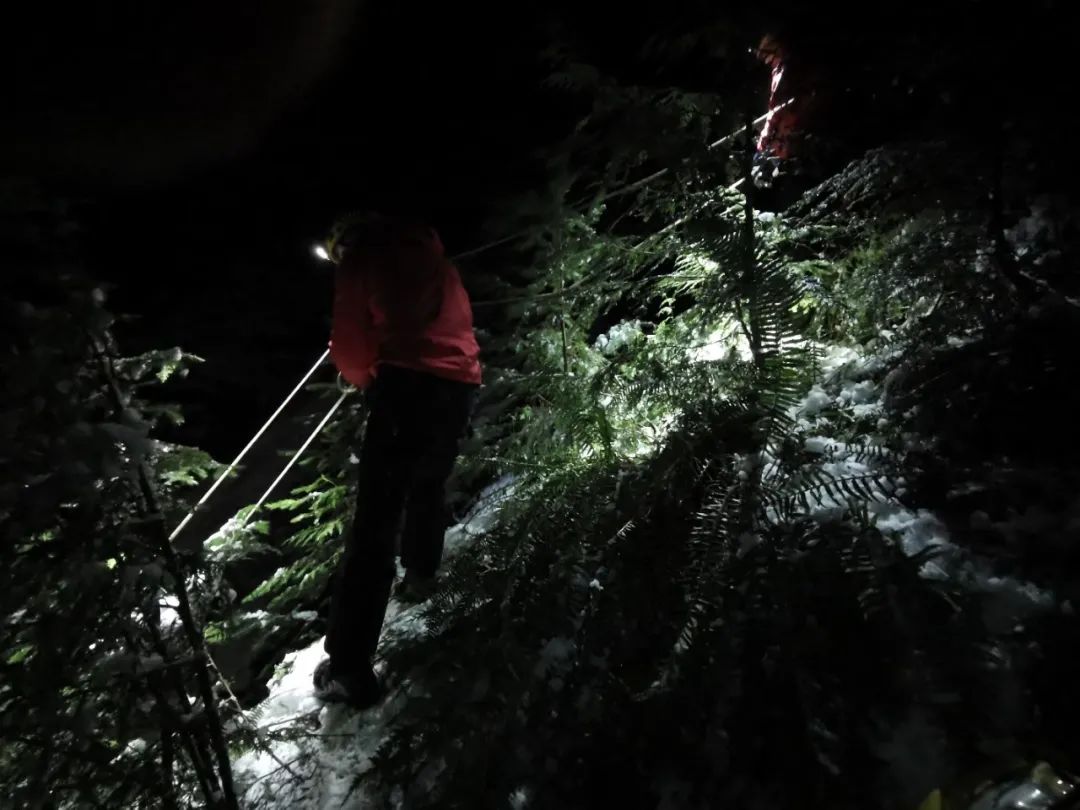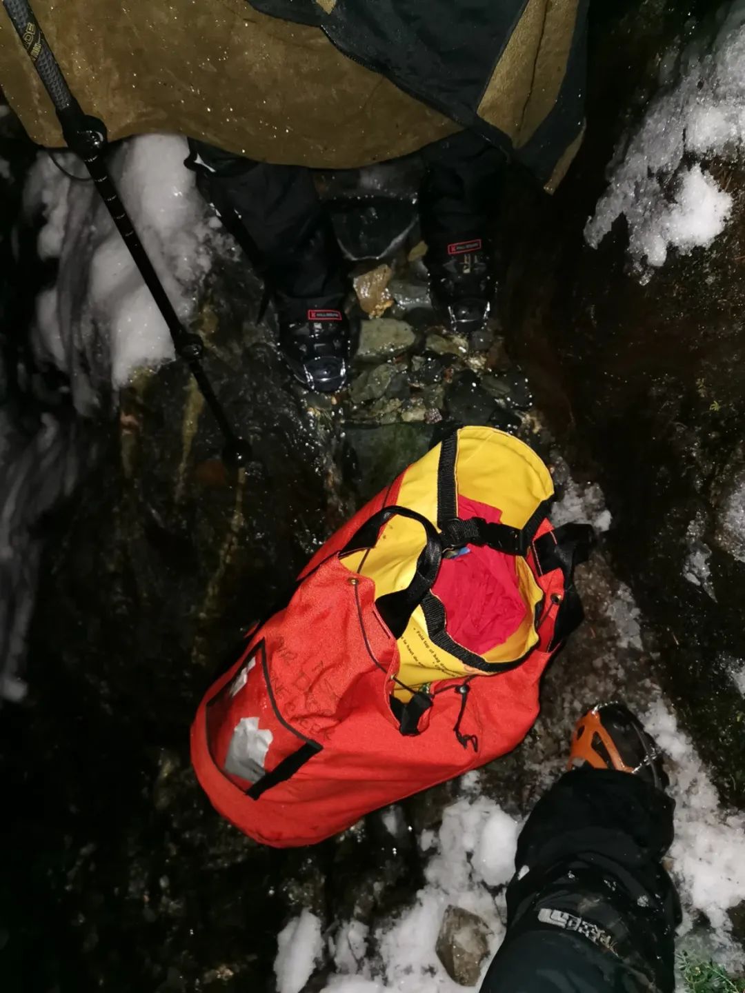 通过头灯看到下面有平缓的雪地,考虑要不直接下到底部过夜,我们没有带露营装备,只能把湿的鞋袜衣服脱掉,然后搭个雪屋,在里面抱团取暖。