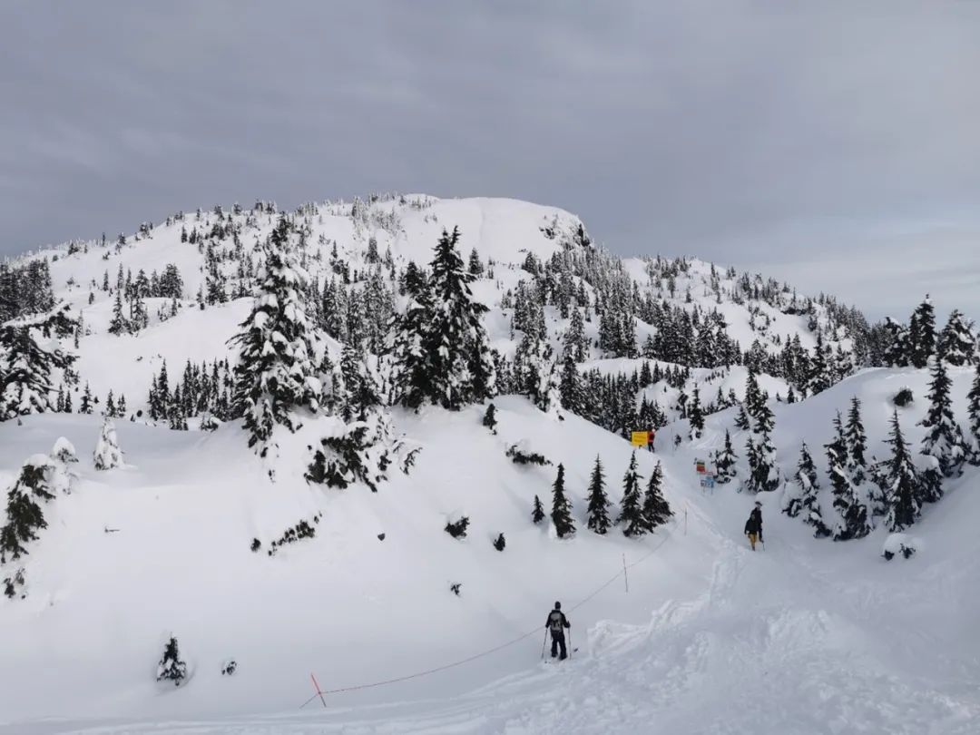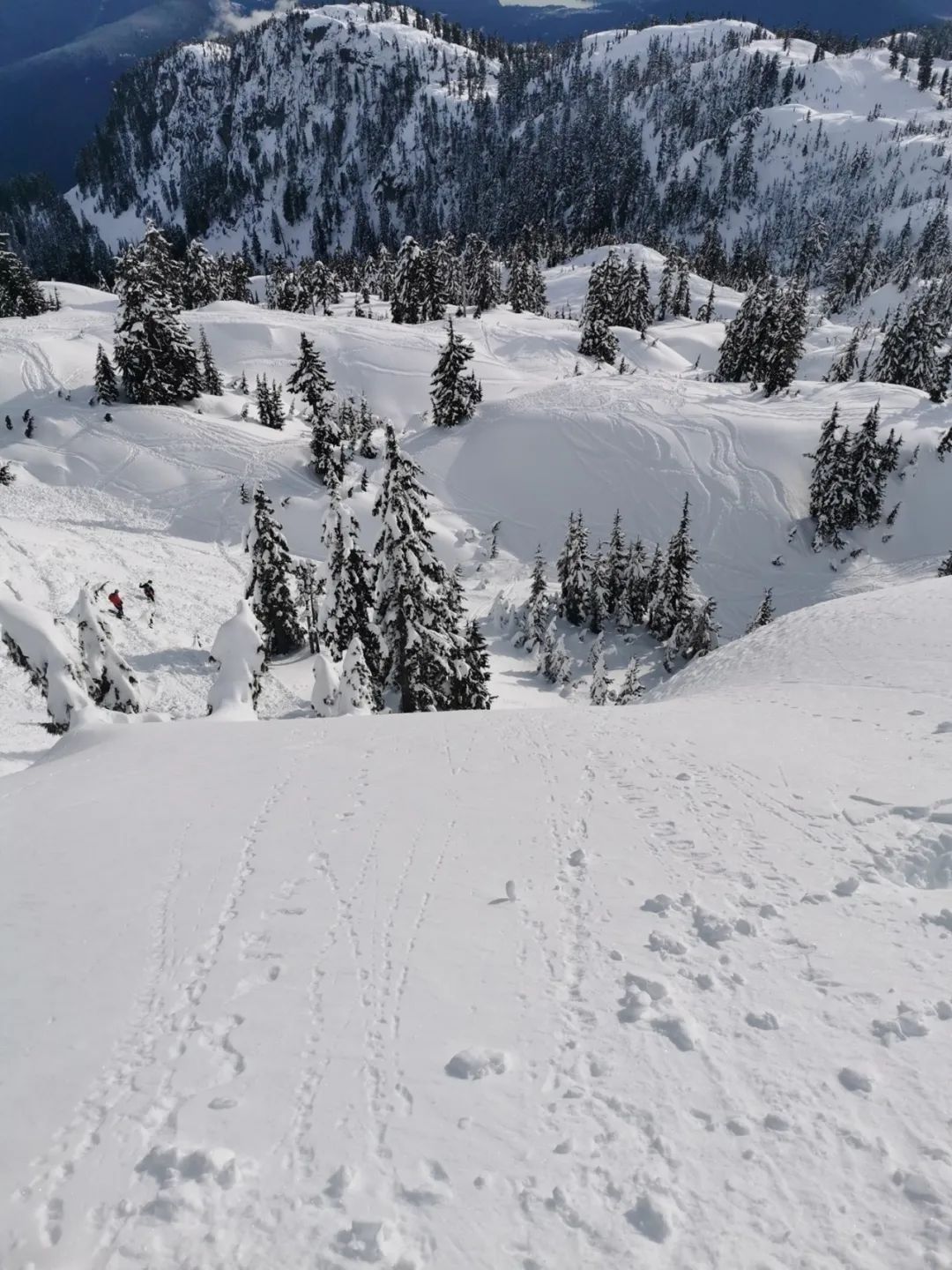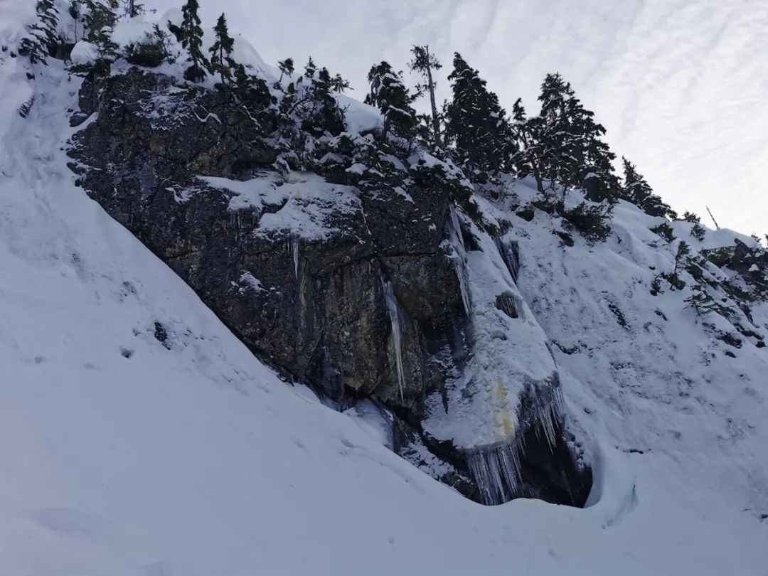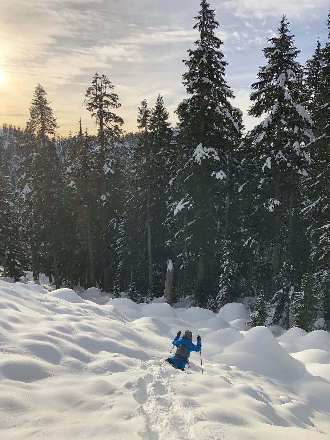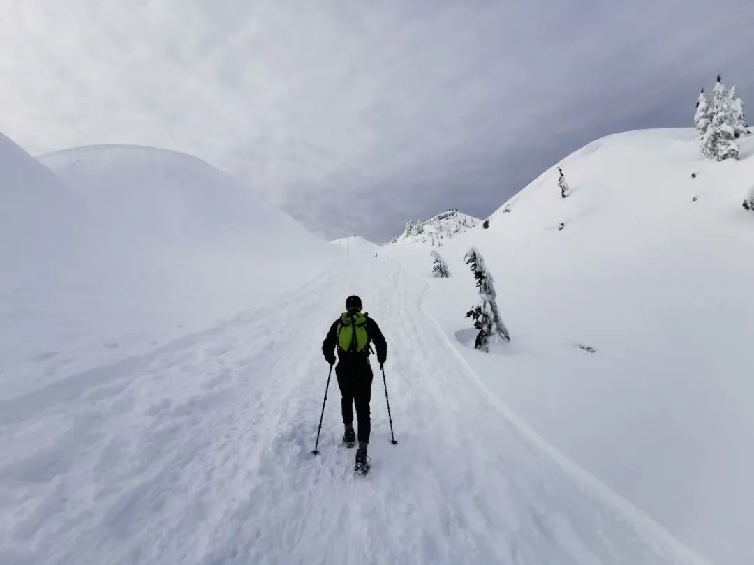 12:00到了Second Peak,从这里到Seymour顶峰除了偶尔的backcountry ski,基本就没有人了。我并不是喜欢冒险的人,出发前了解最后的坡度会比较陡,怕有冰,没有带雪鞋。但是摆在眼前的是新雪,没有雪鞋足迹,用冰爪在齐腰身的雪里爬升会非常耗费体力,评估了接下来的路况和体能,我们决定放弃登顶。