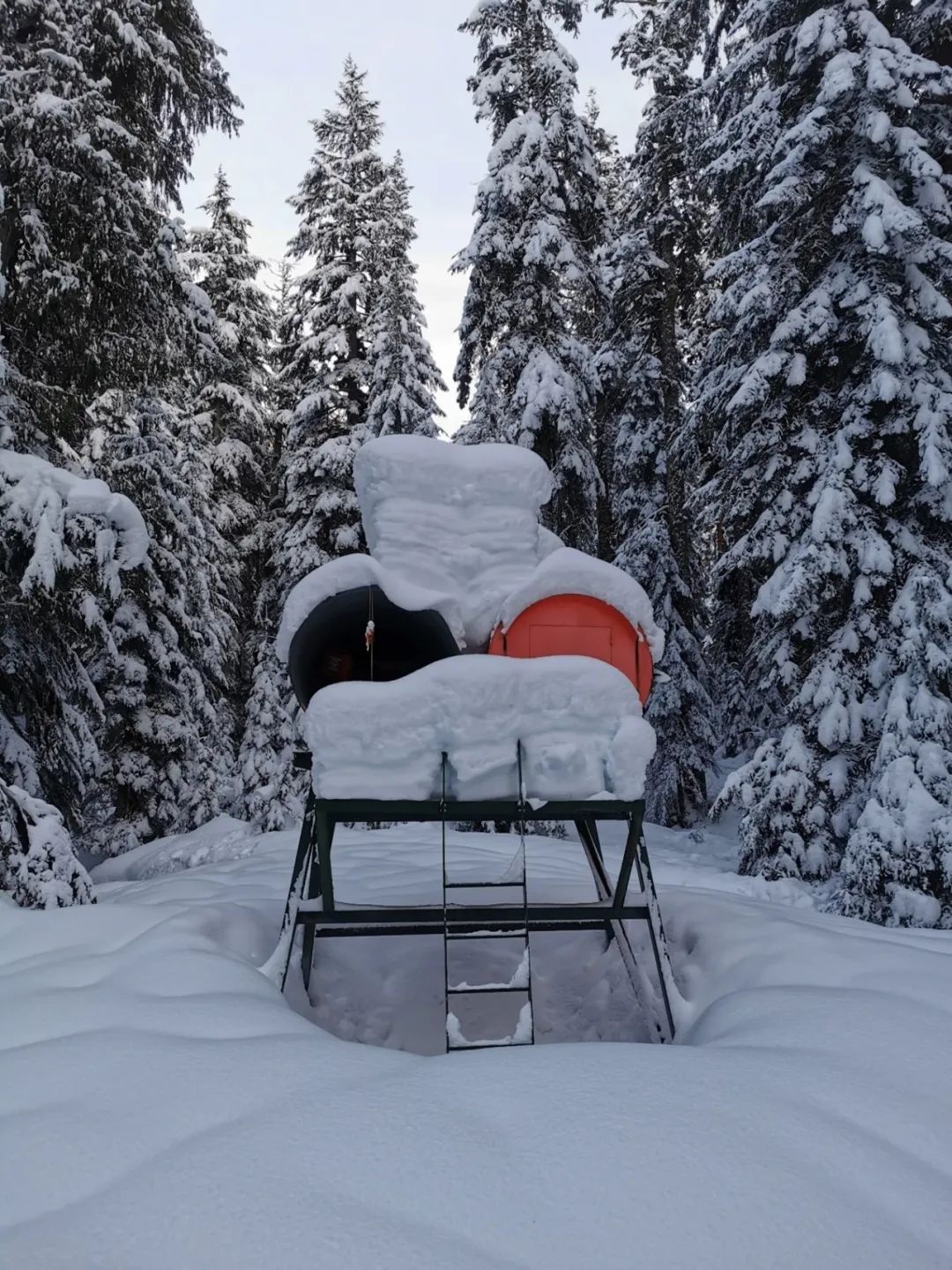 涉水跨过了几条小溪后,看到了一个shelter,由两个铁桶组成的,是给迷路走失的人庇护用的,上去的梯子已经被雪厚厚地盖住,我们用登山杖从侧面勾出雪铲,清理积雪后爬进去,看到无线电,食品和毯子。这真是绝望中寻找希望,人生终将辉煌。