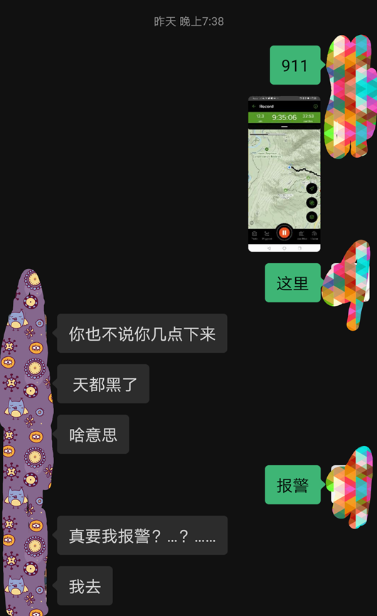 我马上通知她报警,并且把我的GPS定位截屏给她。奇怪的是不能通话不能语音,只能打字,我猜想救援队在占用我的手机频段进行定位(后来和救援队核实,并没有通过手机定位,他们还一直试图用电话短信联系我,一直未果。突然有了网络信号,得到了救援队的指令,阻止了我们继续攀岩下降的想法,这一直是我心中的迷)。