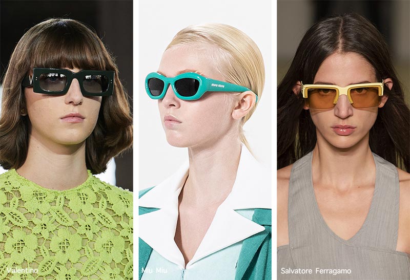 在Miu Miu,一个充满青春气息的系列通过添加带有鲜艳橙色或蓝色镜框的矩形太阳镜来完成。