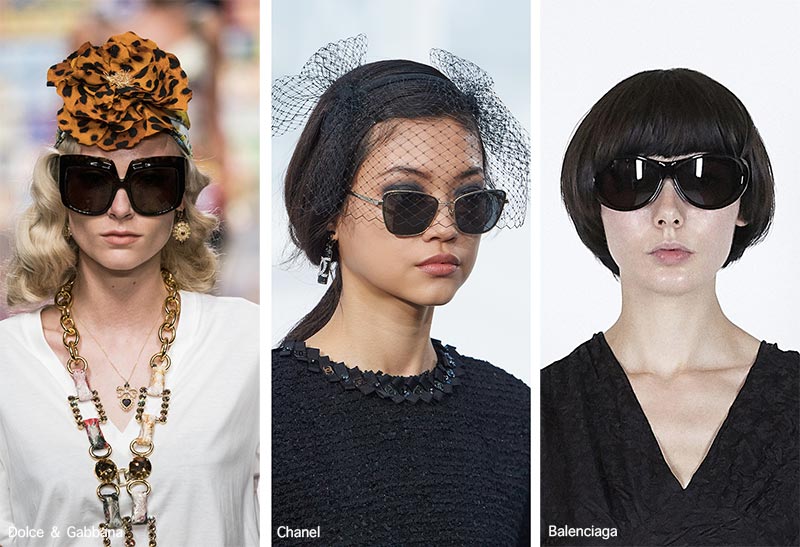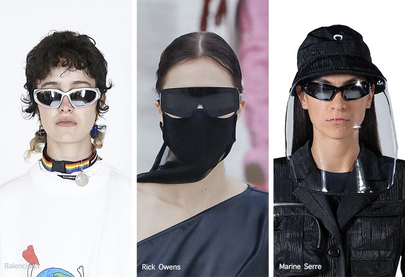 想要更迷人的东西,你可能会喜欢香奈儿(Chanel)的太阳镜,猫眼形状的银框配上黑色镜片。模特戴着黑色透镜的“徒步旅行者”(wayfarer)太阳镜,戴着面罩。