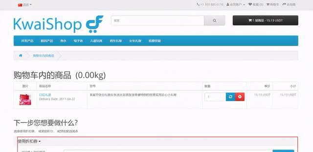 选择喜欢的商品放入购物车,点击“购物车”,选择“使用折扣券”,输入站内的“折扣券码”,就可以抵15USDT了。