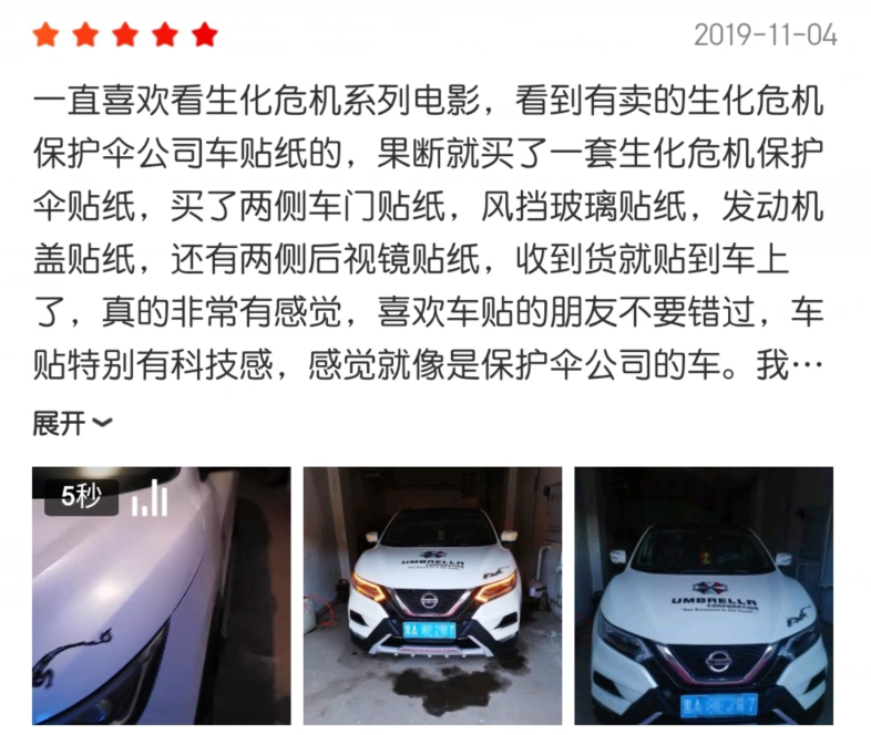 不论是通过游戏还是电影认识安布雷拉,在车上贴上它的标志都能造成一种神秘的中二感,让车主暂时从一个打工人,变成安布雷拉的特工。