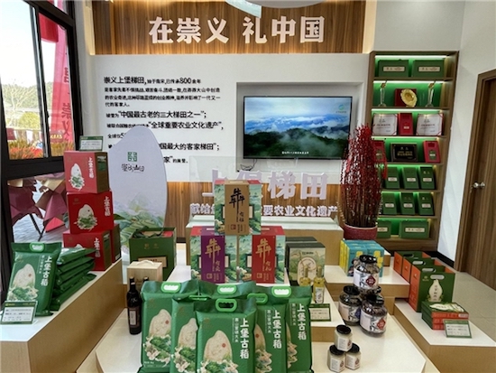 “崇水山田”,山是阳明山、水是阳明湖、田是上堡梯田,代表的就是崇义的山水林田湖,以及这片山水林田湖上生产出来的生态物产。“崇水山田”生态物产以绿色、有机、富硒为导向,对产品质量严格检测把关,去年以来,赤水仙高山茶、龙归绿茶、高山梯田米等6个产品通过富硒产品检测认定,崇义高山茶、上堡大米分别荣获中华品牌商标博览会金奖、第二届江西“生态鄱阳湖 绿色农产品”博览会产品金奖,全省首个南酸枣地方标准《地理标志产品崇义南酸枣》正式发布实施。“崇水山田”实行“双品牌运营”,初步构建了区域品牌与企业品牌相结合的“1+N”母子品牌体系。经过精挑细选、优中选优,目前已经有高山茶、山茶油、梯田米、黄元米果、竹笋粉丝等35个本地名优产品纳入了“崇水山田”区域品牌。
