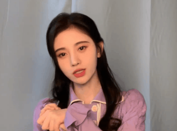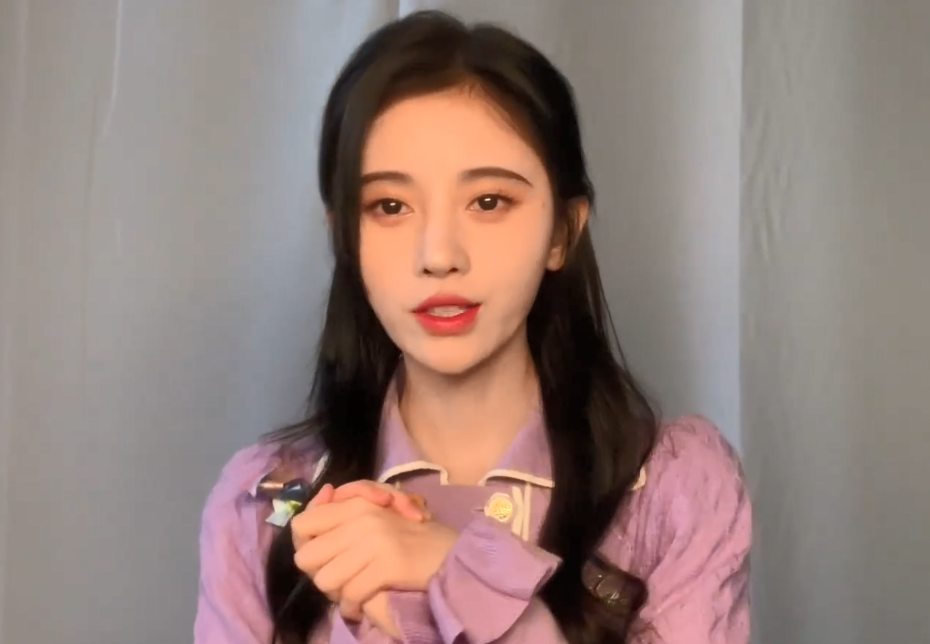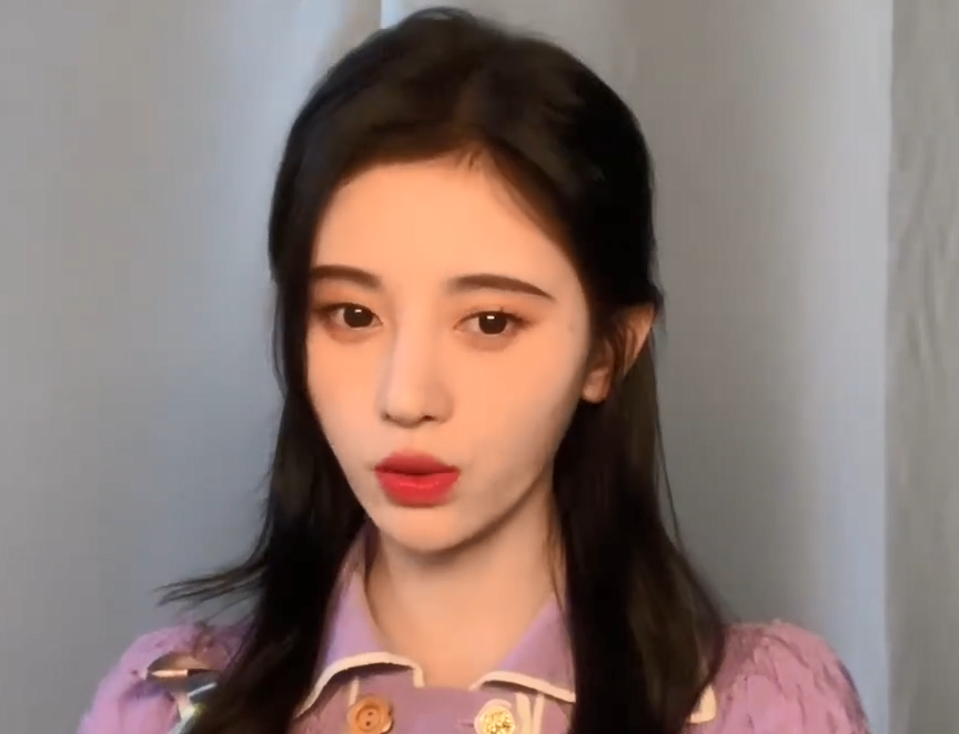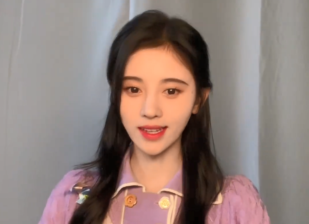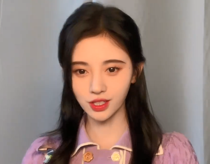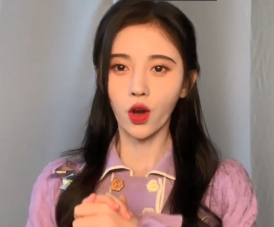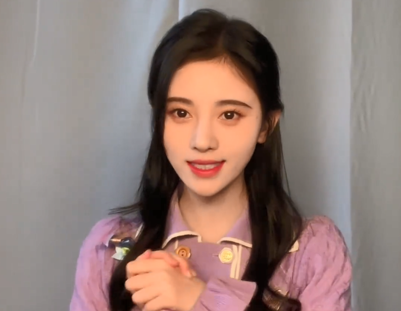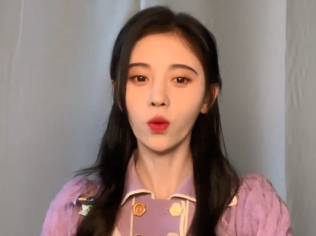 虽然视频背景是明星常用的朴素窗帘背景,但能看出鞠婧祎对打光造型的要求并不简单。她身穿香芋紫宫廷风上衣,在暖色正面光和磨皮滤镜的共同作用下,看不到她脸上的一丝瑕疵。