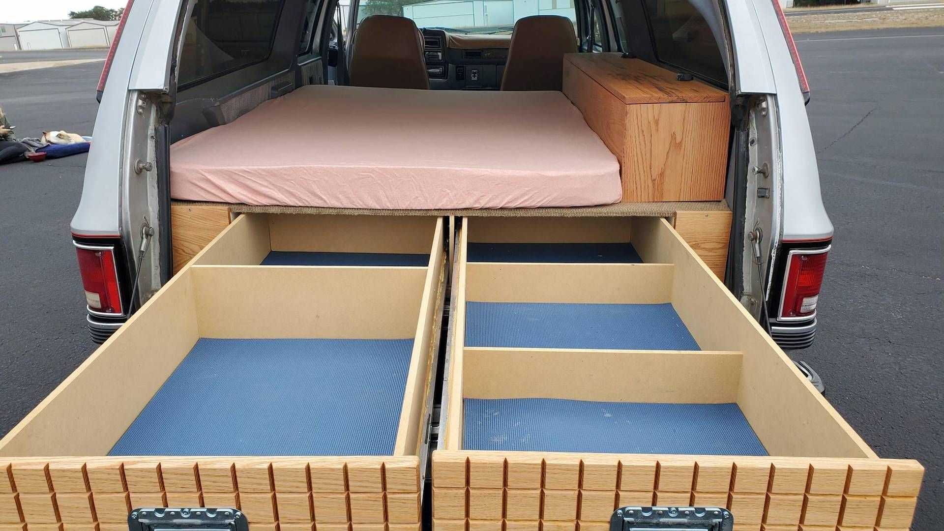 银色和黑色饰面的方形雪佛兰Suburban从外观看起来并不张扬,但在车内却大有不同。它的车内经过大量改装,转变为了一款露营车。最明显的改变是缺少了后排座椅。