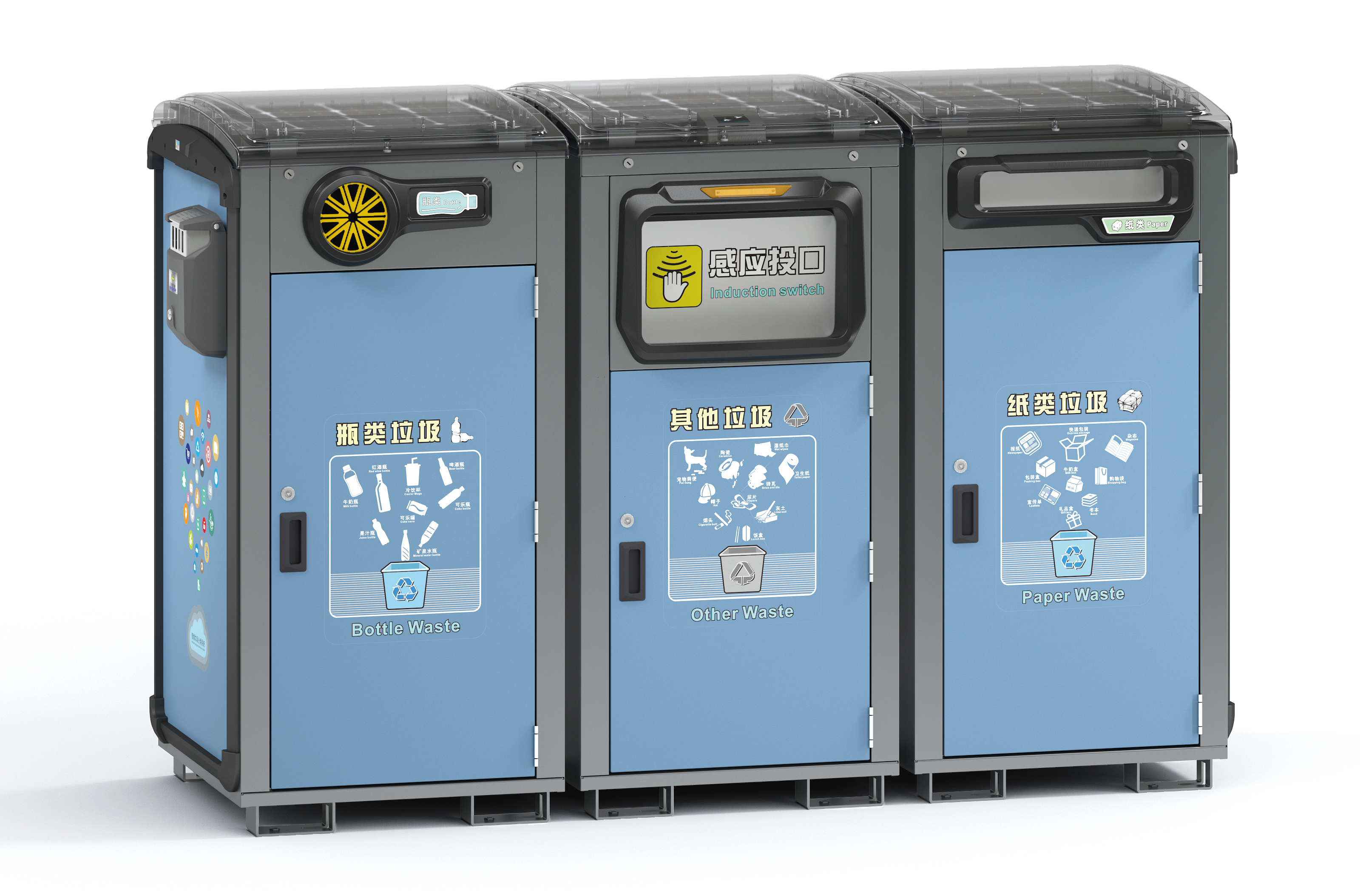 太阳能压缩式垃圾箱为组合式多分类垃圾箱,模块化箱体组合方便快捷。瓶类垃圾、其他垃圾和纸类垃圾单独分开投放,方便瓶类垃圾、纸类垃圾的回收利用和其他垃圾的清运处理。箱体内置感应压缩模块,当桶内垃圾达到一定的量,垃圾自动被压缩,内桶因此可以容纳多倍的垃圾。此款垃圾箱采用人体感应开门,当手部靠近设备投口时,挡板自动开启,无接触式投递垃圾更卫生更安全。
