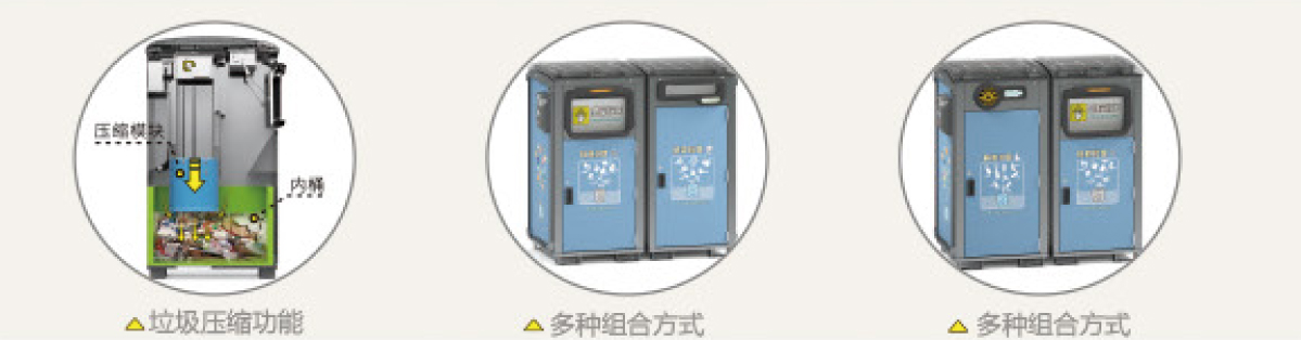 这款新型智能垃圾箱最大的特点就是内置感应压缩模块,待箱体内的垃圾达到一定的量,通过箱体内置的感应压缩模块,自动向下压缩桶内垃圾的体积,系统可以在几十秒内完成垃圾压缩,挤压力度大,垃圾压缩后,一台智能垃圾分类箱能容纳更多垃圾,是其自身正常容量的多倍,因此又被称为“大胃王”。