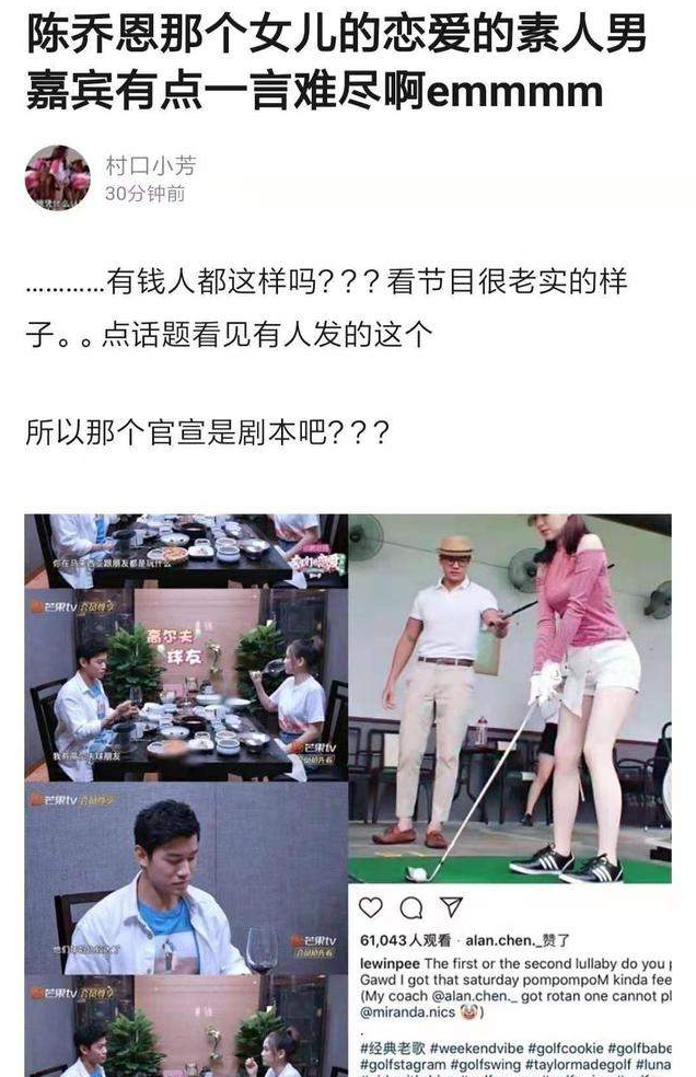 当时节目里陈乔恩与艾伦前脚刚官宣了恋情,节目时老实不善言辞的男朋友艾伦就被网友扒出私底下是个爱玩的富二代。