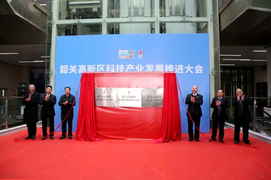 领导为韶关高新区文化创意众创空间、医药健康创新创业基地、科技综合服务中心揭牌。