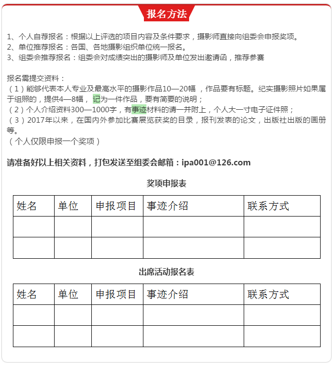 1、有正规注册的法人单位,注册地包含但不局限于中国,世界各国摄影组织均可自荐或被推荐报名;