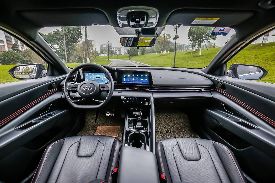 进入车内更是如此,和每一代轩逸在和“老大哥”天籁保持同步or居家风之间纠结不同,第七代伊兰特采用了市面上少见的沉浸式座舱设计。同级独有的双12.5英寸智慧连体屏与贯穿式空调出风口、多达64种颜色及10种亮度可调的氛围灯带来了十足的科技感。同时D型多功能方向盘、飞航式换挡杆和独特的副驾驶结构扶手又将驾驶区域进行了突出,让人置身其中便会沉浸于此。