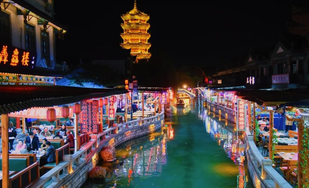 入夜,古城河道岸上的建筑流光溢彩