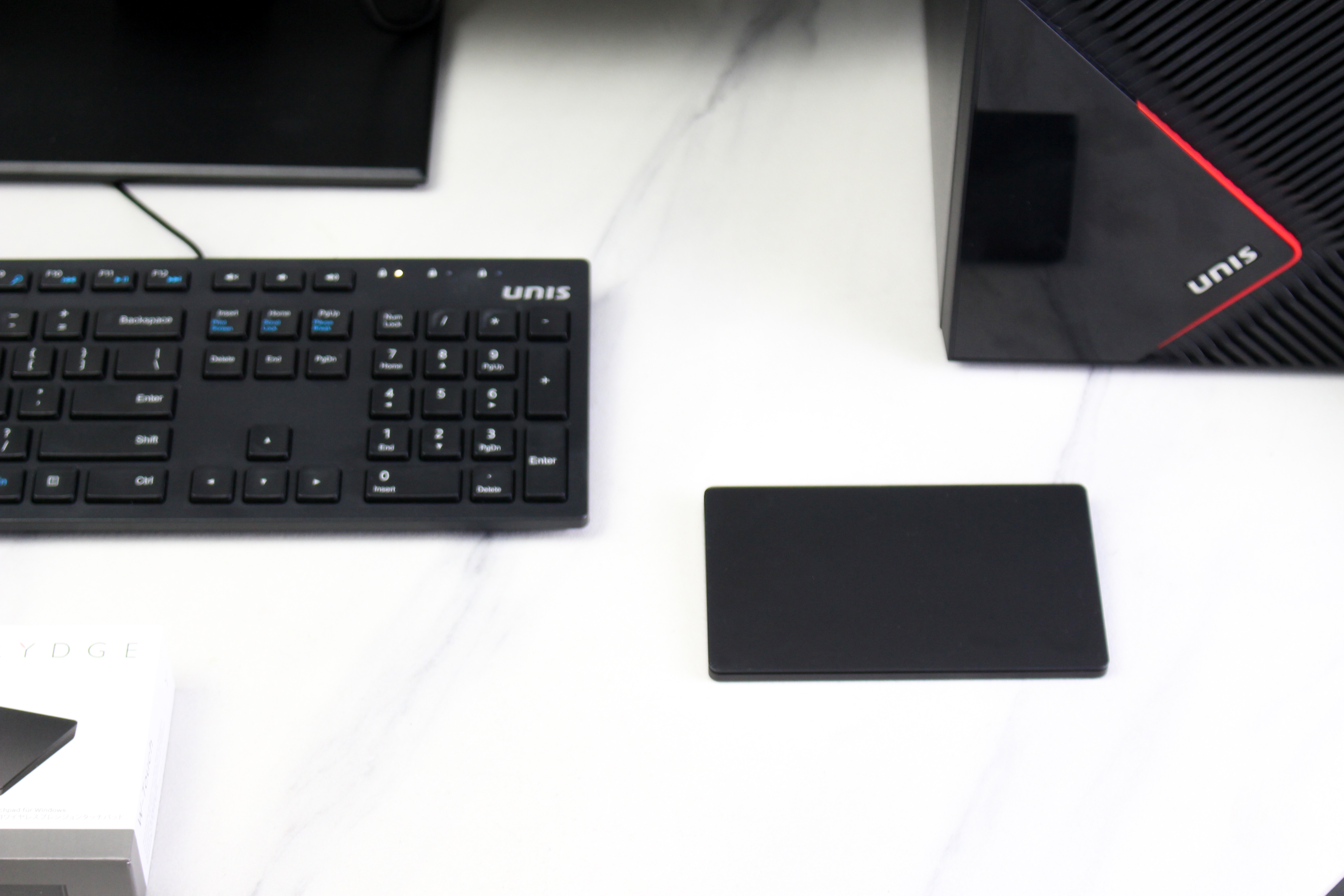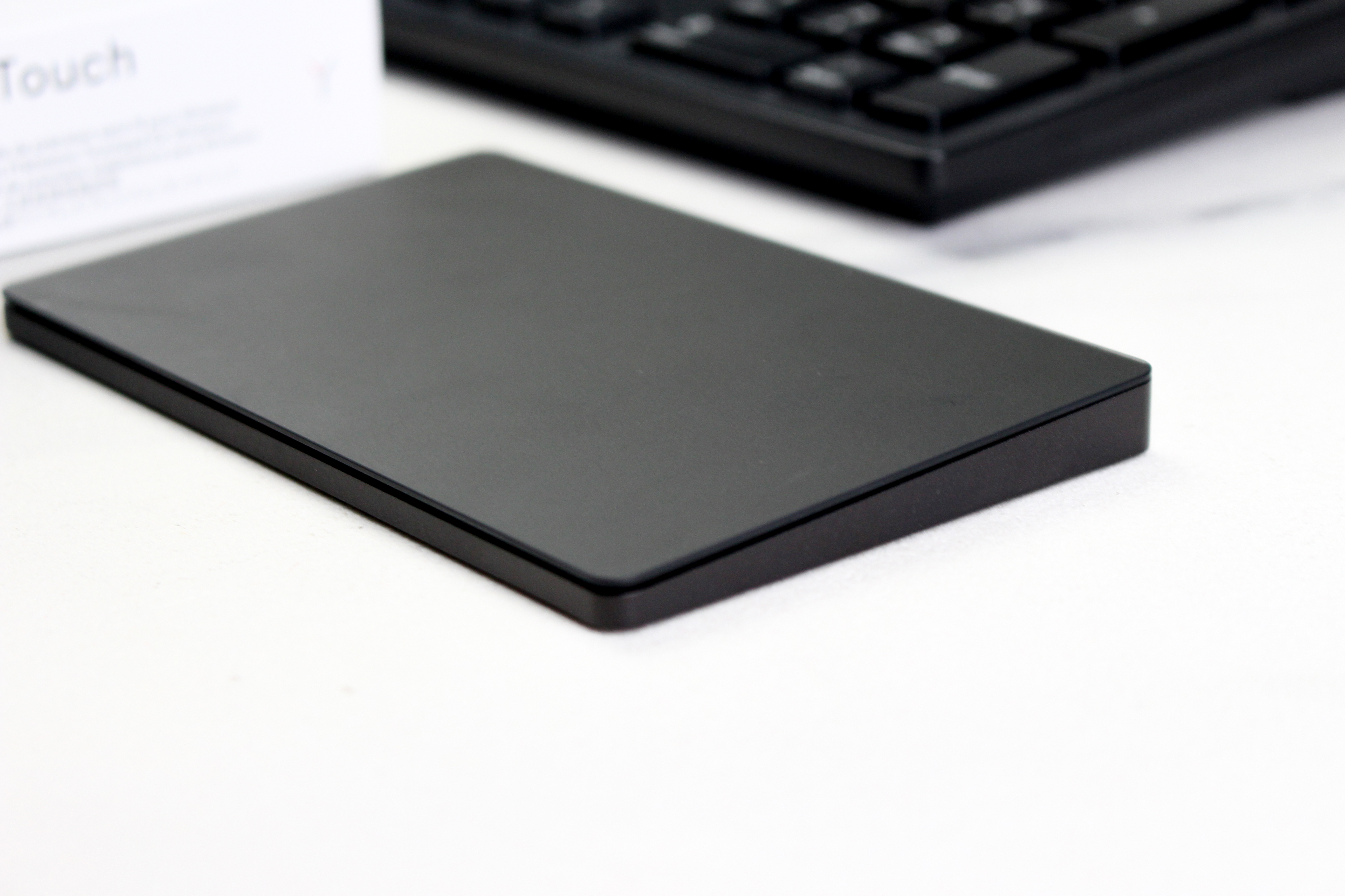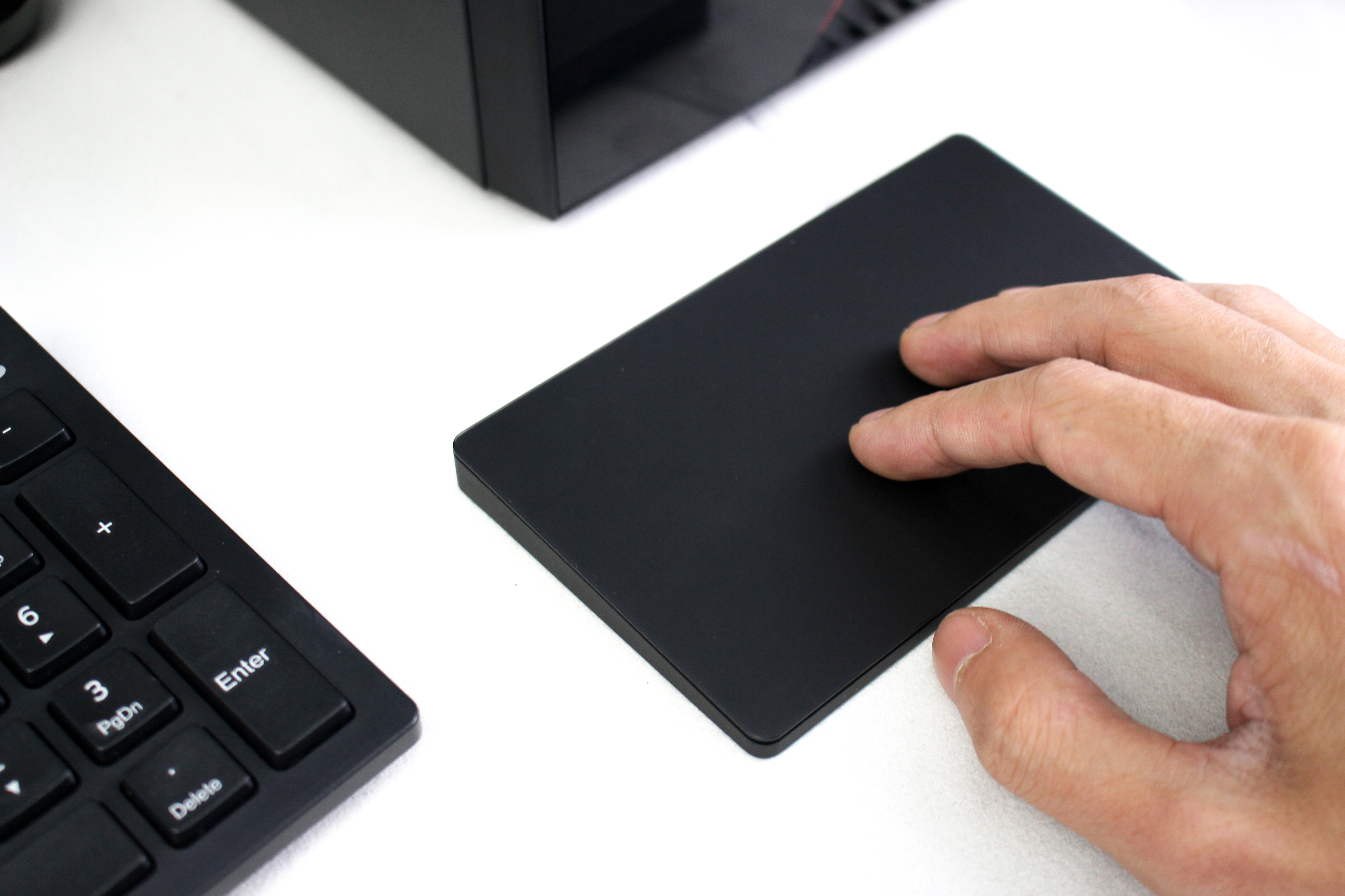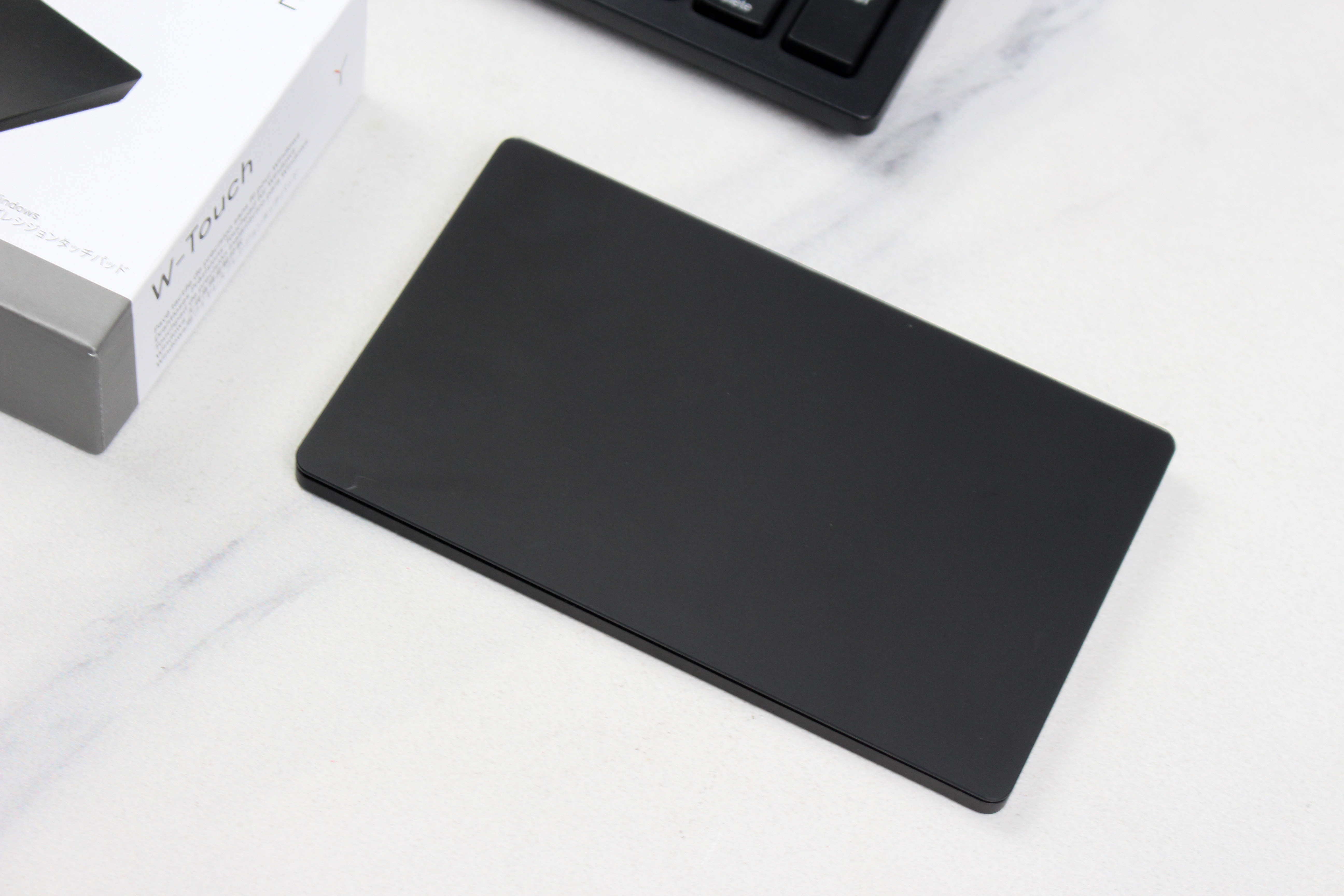 外观上,这款W-Touch触控板采用了纯黑色外观设计,尺寸大小为140mm×84mmx11,mm,机身采用了铝合金材质,整体来看十分轻便小巧。正面的触摸部分表面有一层涂层处理,触摸的细腻程度很不错,操作的时候很舒服。底部则有4个防滑垫,以此来保证在各种桌面使用不打滑。