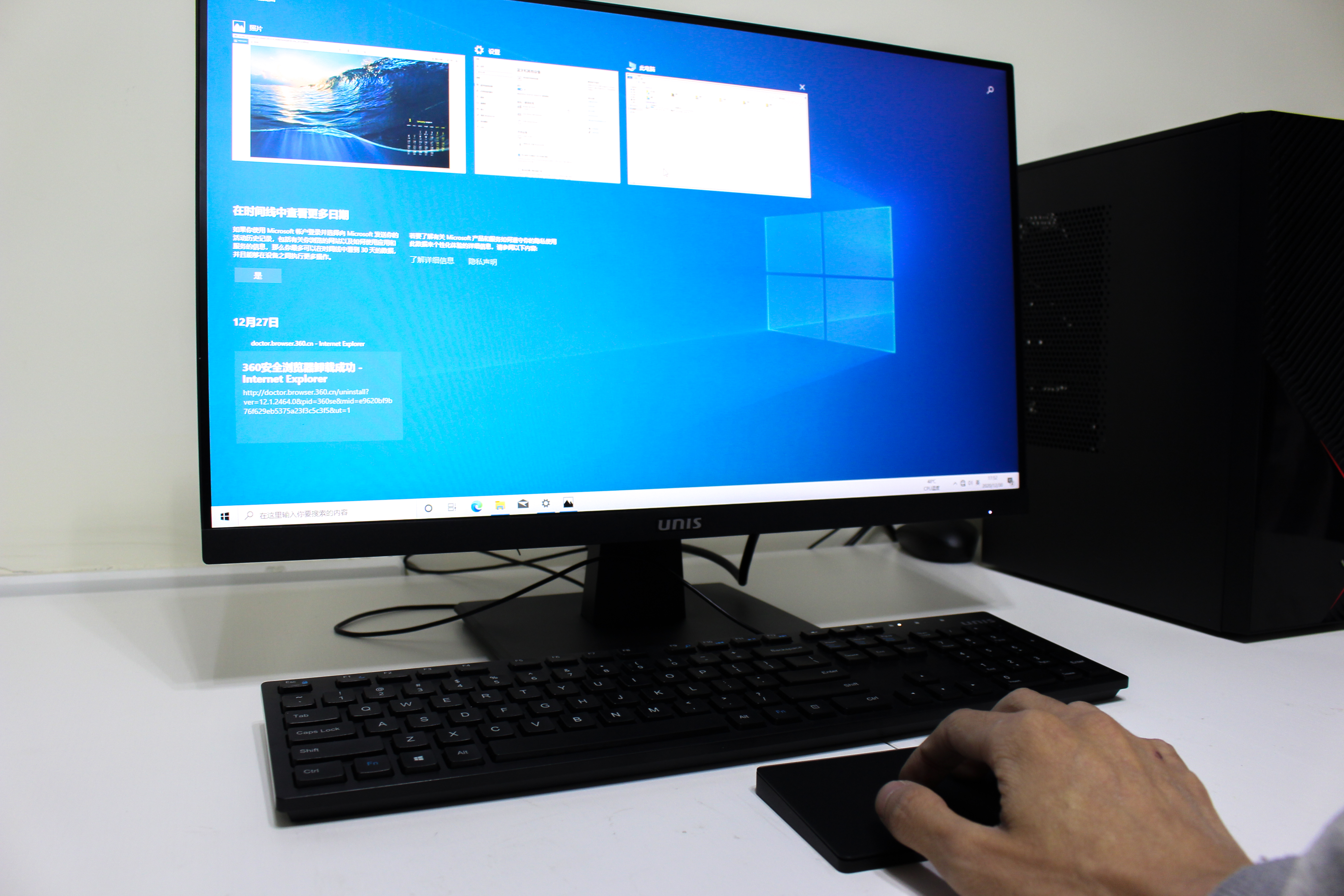 另外,它的多指手势功能用起来也很方便,以往在电脑上,我们要快速显示桌面,如果单纯用鼠标操作的话,通常都是点击任务栏最右边,在这款触摸板上,我们只需要将4根手指轻轻的向下滑动,就可以快速的切换到桌面了,而当有多个任务开启时,如果想要快速的切换到想要的任务时,通过向上滑动,即可把全部人物小窗口排列,一下就能实现切换或者关闭。而且每个方向都有不同的功能,体验还是很不错的。