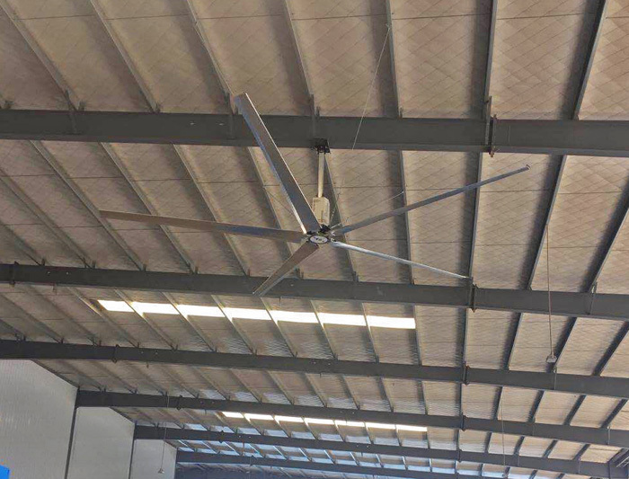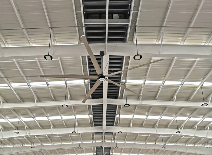 安伯玛工业大风扇在吸收国际先进科技理念的基础上,自主研发、制造的5个叶片的高风量低转速(HVLS)工业大风扇。运行时可推射大量气流到地面,在地面形成一定高度的气流层水平运动,从而促成了整体空气循环。通过过门窗或屋顶风机不间断的向室内输送室外新鲜空气,不断地稀释室内污染物,将室内二氧化碳、甲醛等有害气体排出至室外,保证室内有效通风与呼吸健康。
