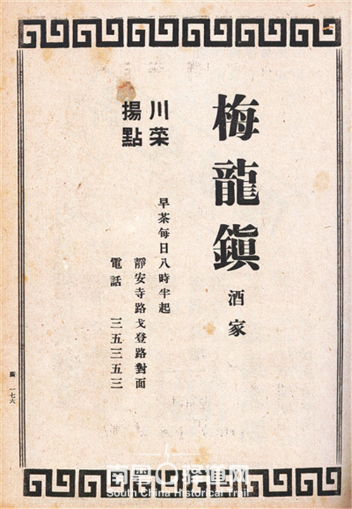 图为龚若冰在赴坪石前,在上海与影星吴湄开设的“梅龙镇酒家”广告,该酒家是抗日救亡文化界人士的秘密聚集地。